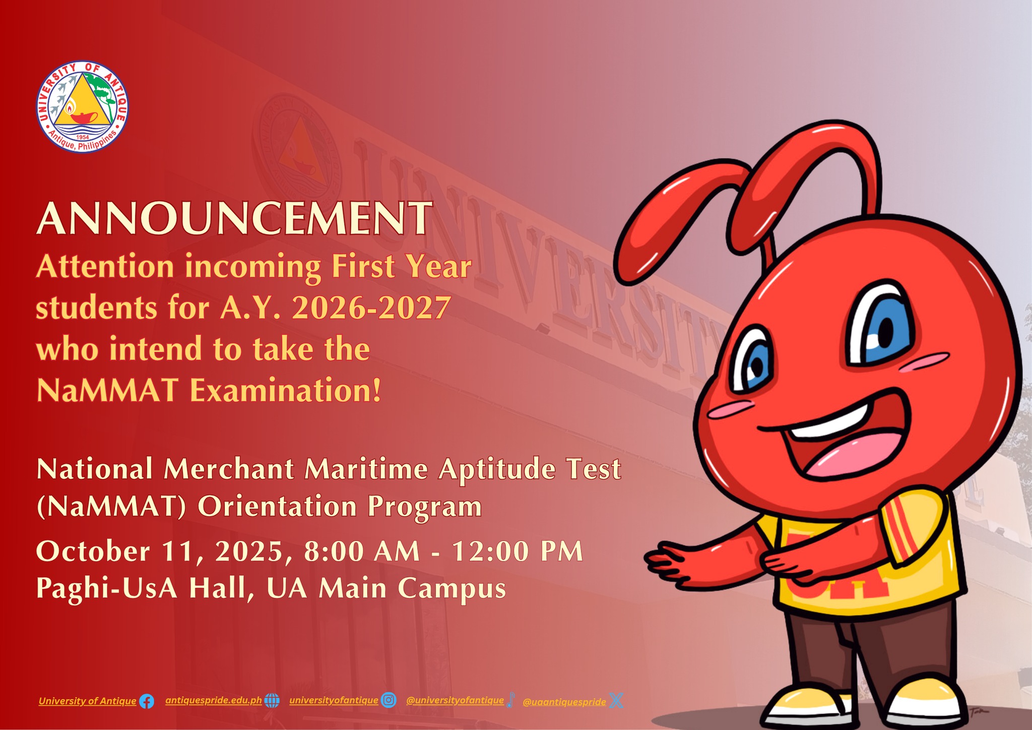 The College of Maritime Studies will be conducting a National Merchant Maritime Aptitude Test (NaMMAT) Orientation on October 11, 2025, 8:00 AM to 12:00 PM at the Paghi-UsA Hall, UA Main Campus, Sibalom.