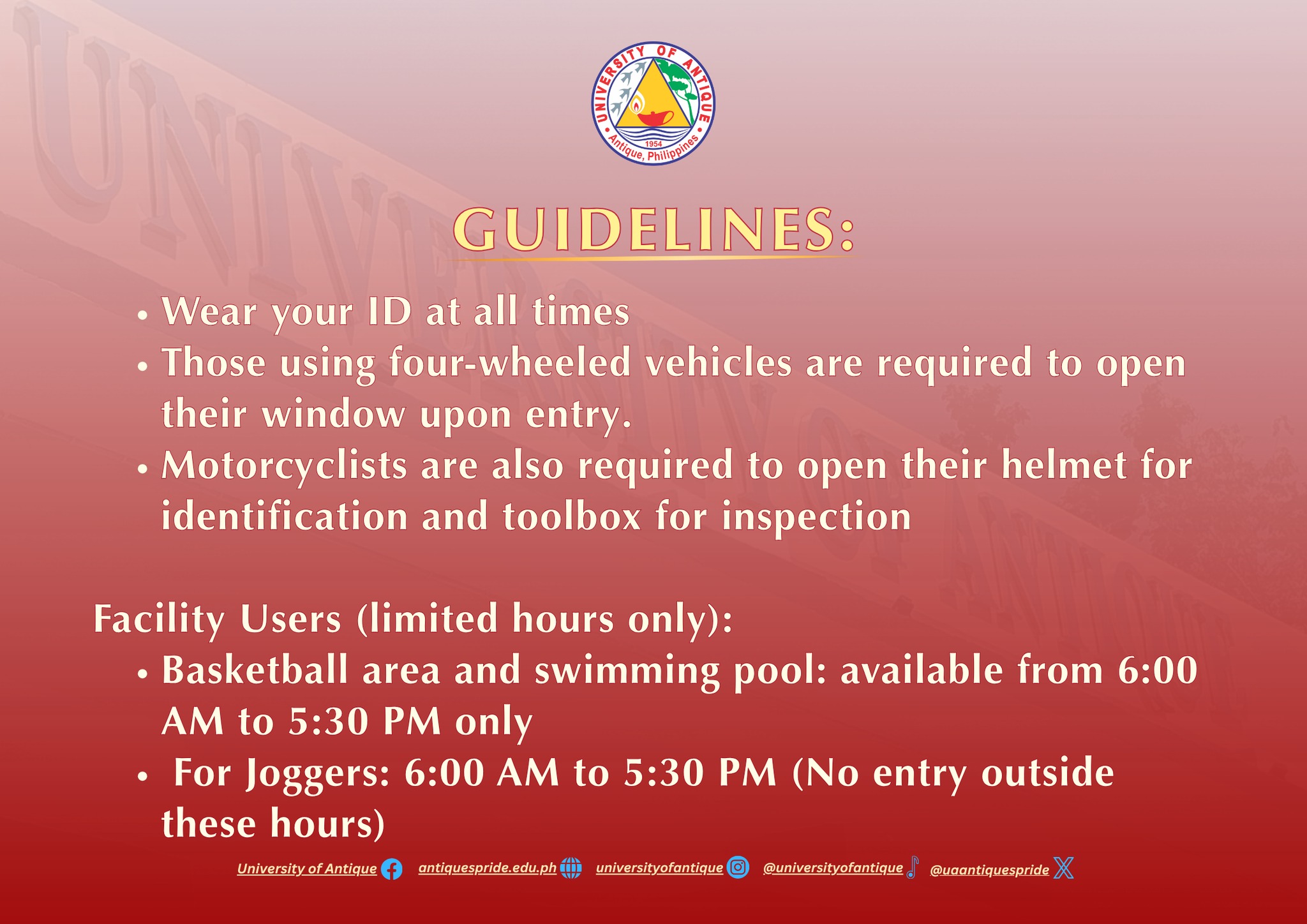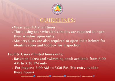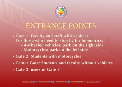 Please take note of the updated entrance points in University of Antique effective November 20, 2025. To ensure everyone’s safety, we will be conducting thorough inspections at the campus entrance points.