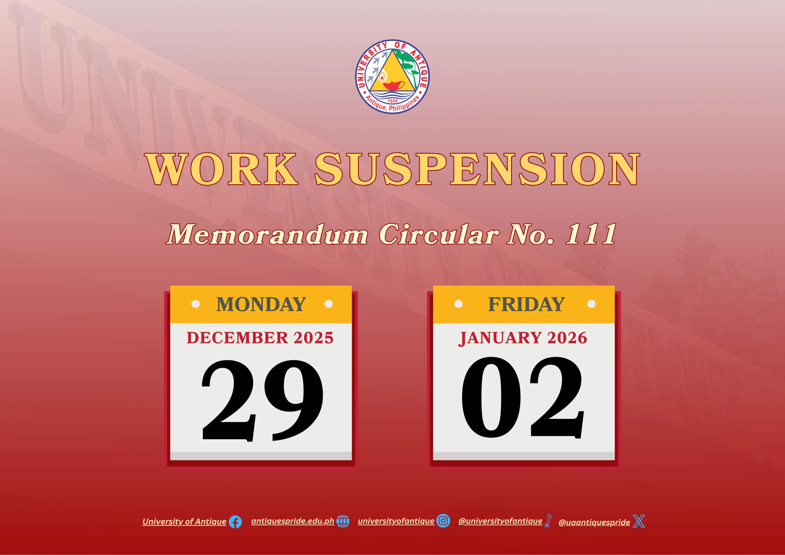 Relevant to Memorandum Circular No. 111 released by the Office of the President – MalacaƱang, work and office operations in the University of Antique System are hereby suspended on December 29, 2025 and January 2, 2026.