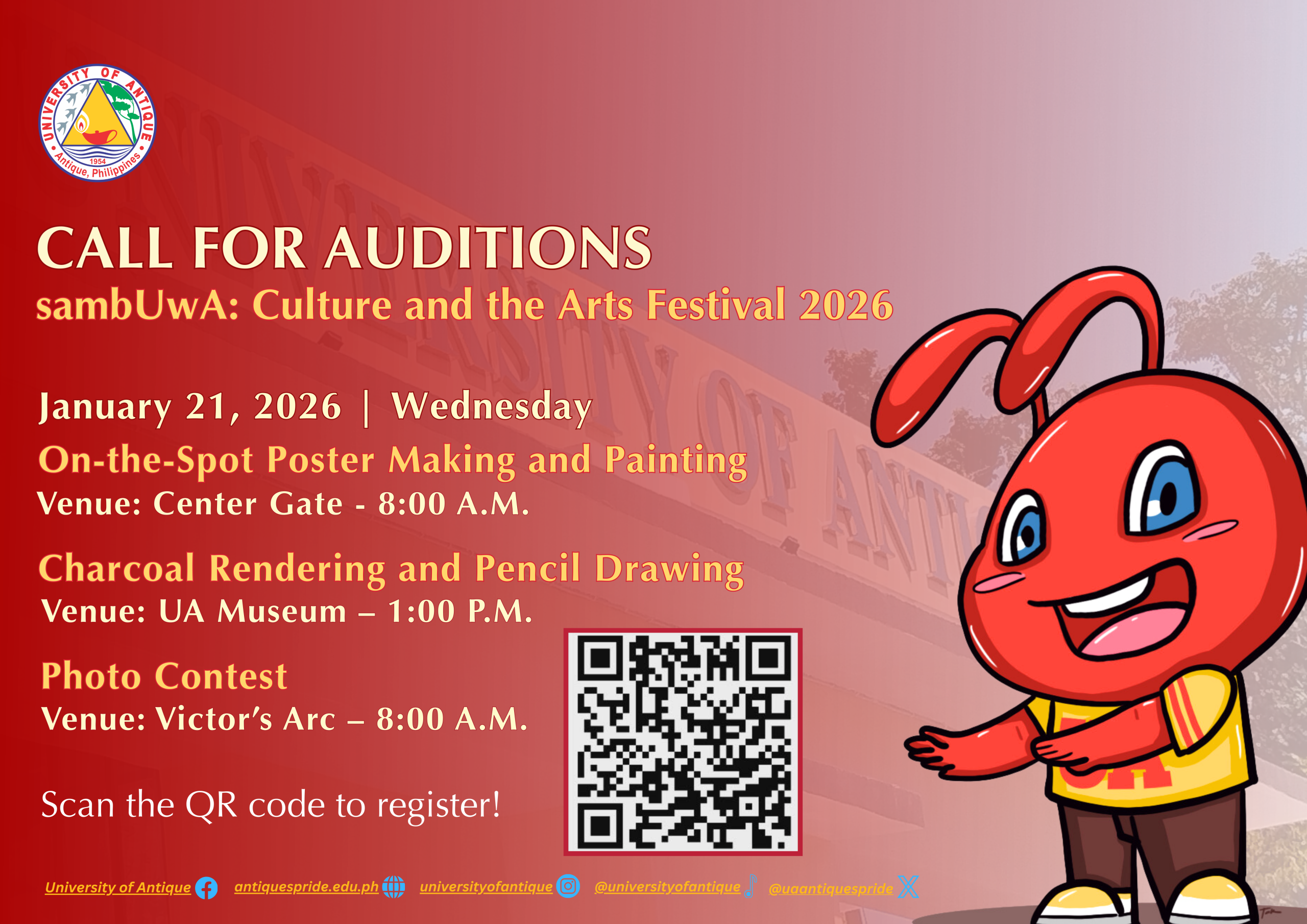 Showcase your artistic skills at the Visual Arts Auditions for On-the-Spot Poster Making & Painting, Charcoal Rendering & Pencil Drawing, and Photo Contest.