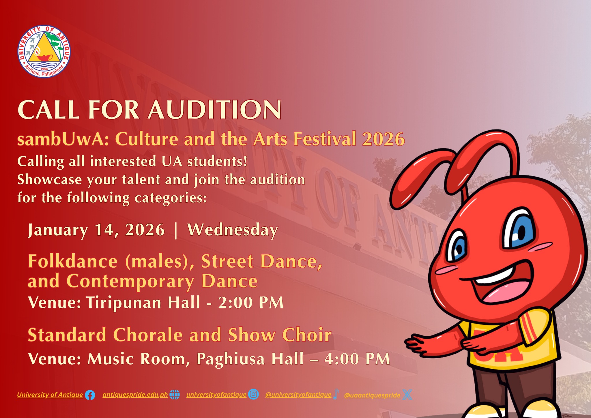 This is your chance to shine, share your passion, and proudly represent the University of Antique on stage!