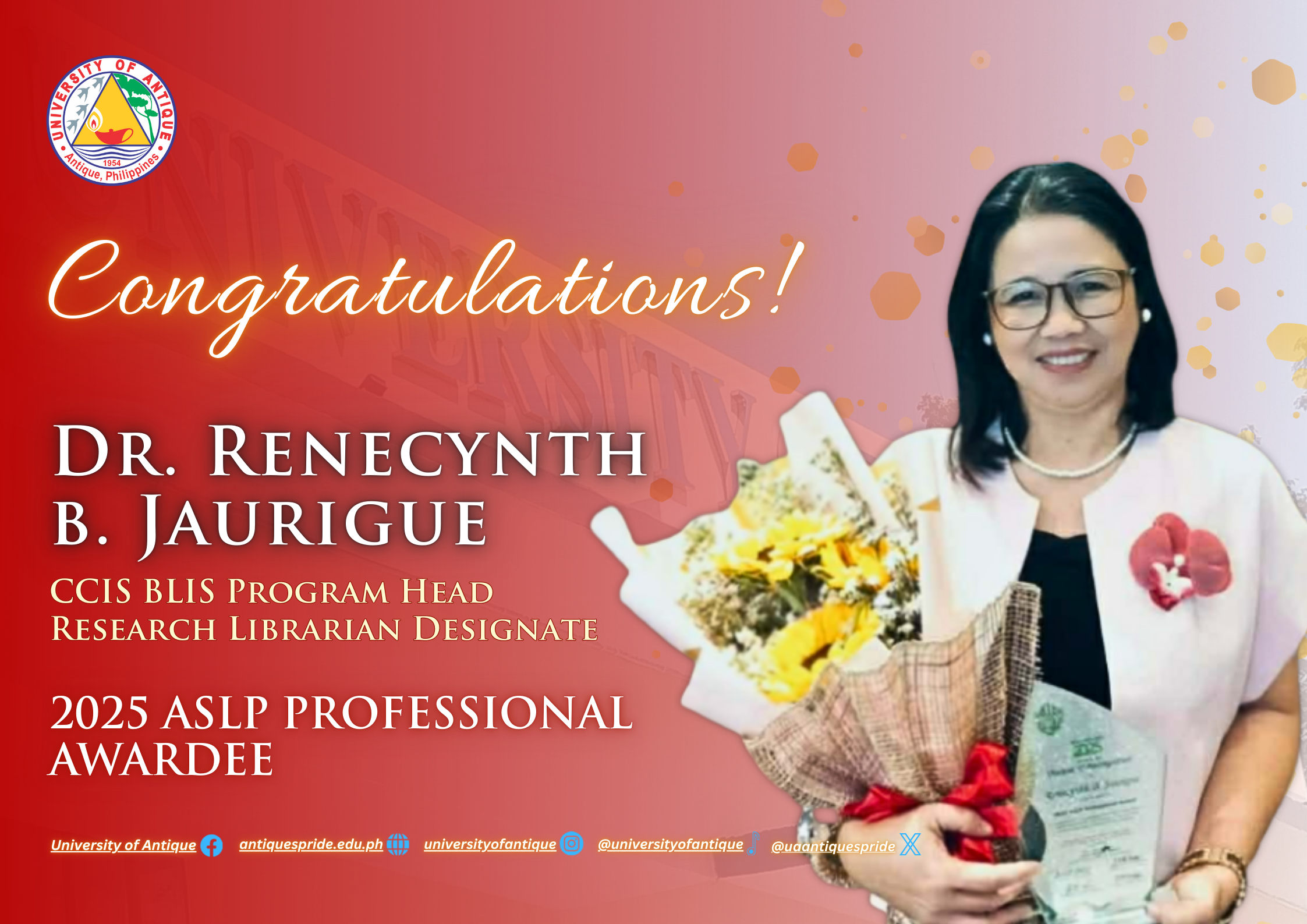 Congratulations, 𝐃𝐫. 𝐑𝐞𝐧𝐞𝐜𝐲𝐧𝐭𝐡 𝐁. 𝐉𝐚𝐮𝐫𝐢𝐠𝐮𝐞, Bachelor of Library and Information Science Program Head, and Research Librarian Designate, on being recognized as 𝟐𝟎𝟐𝟓 𝐀𝐒𝐋𝐏 𝐏𝐫𝐨𝐟𝐞𝐬𝐬𝐢𝐨𝐧𝐚𝐥 𝐀𝐰𝐚𝐫𝐝𝐞𝐞 by the Association of Special Libraries of the Philippines (ASLP).