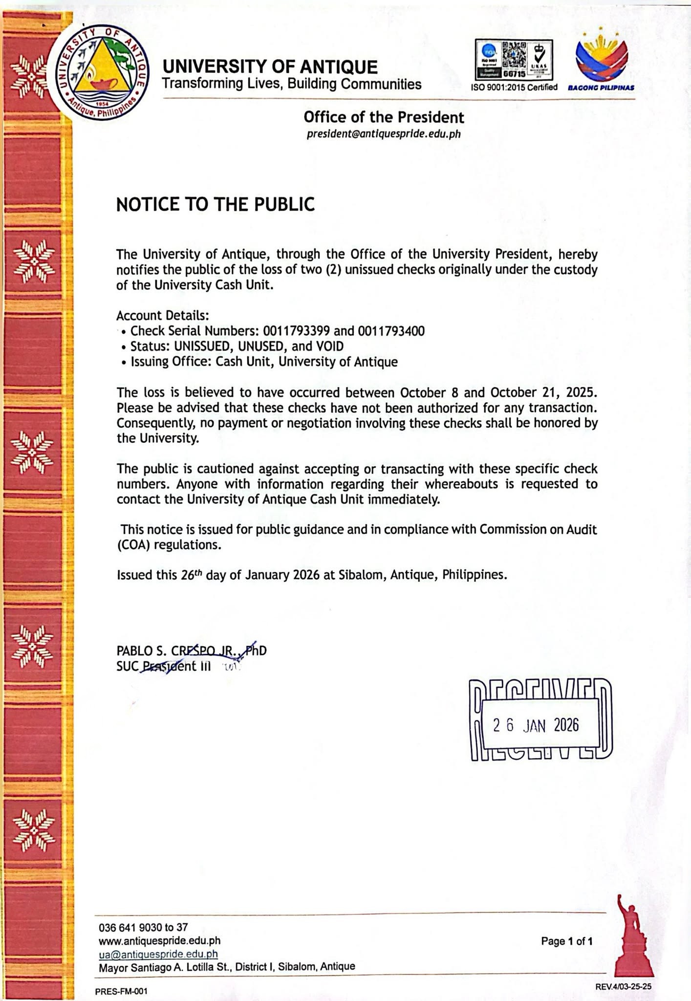 To our valued clients, please be advised that Check Serial Numbers 0011793399 and 0011793400 have been reported lost and are now considered VOID. If you have any concerns, kindly reach out to us.