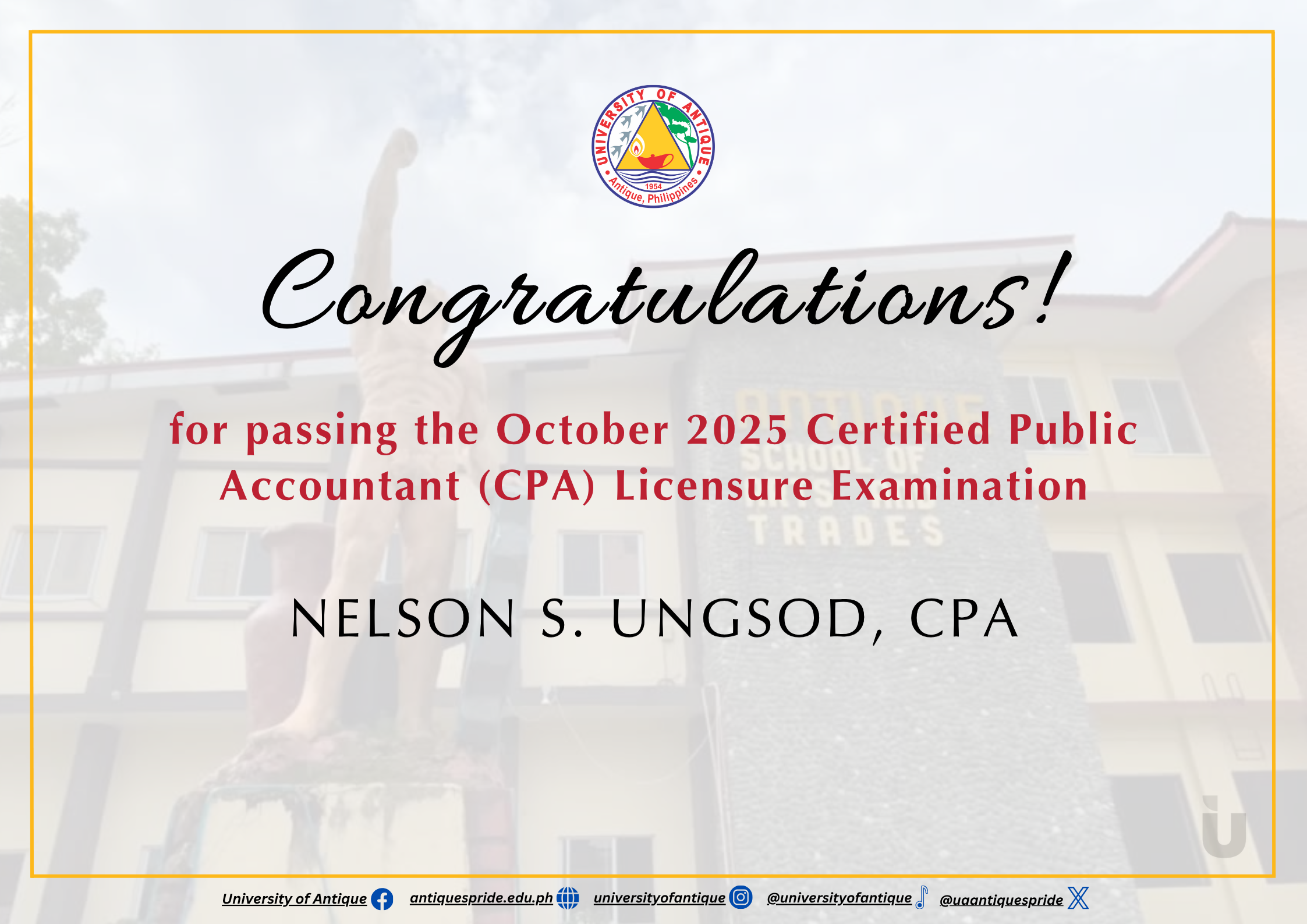 Huge congratulations to our new Kasubay Certified Public Accountant (CPA), 𝐍𝐞𝐥𝐬𝐨𝐧 𝐒. 𝐔𝐧𝐠𝐬𝐨𝐝, for passing the October 2025 Certified Public Accountants Licensure Examination (CPALE).