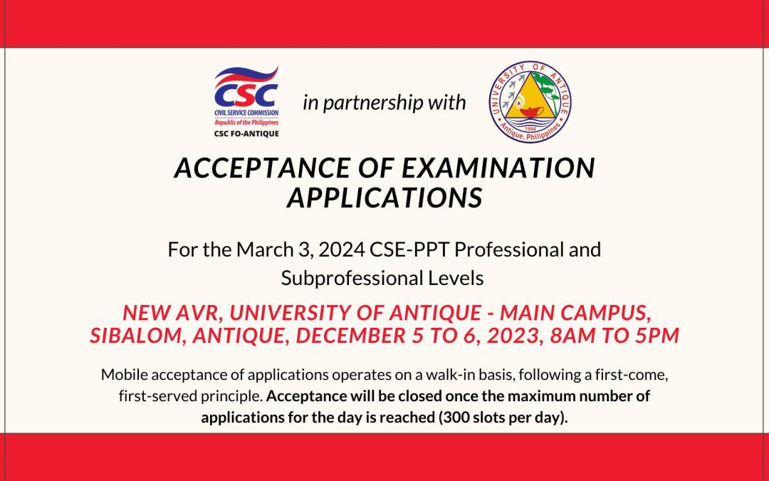 Planning to take the Civil Service Commission’s Career Service Examination? The CSC Field Office Antique will be at the New AVR (Old GEB) in University of Antique, Sibalom on December 5-6, 2023 to...