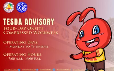 For our 𝐬𝐭𝐮𝐝𝐞𝐧𝐭𝐬 𝐚𝐧𝐝 𝐚𝐥𝐮𝐦𝐧𝐢 coordinating with 𝐓𝐄𝐒𝐃𝐀 Provincial Office – Antique, please note of their Four-Day Onsite Compressed Workweek schedule: • Monday to Thursday – 7:00 AM – 6:00 PM This is in compliance with the Office of the President’s Memorandum Circular No. 114 and in support of...
