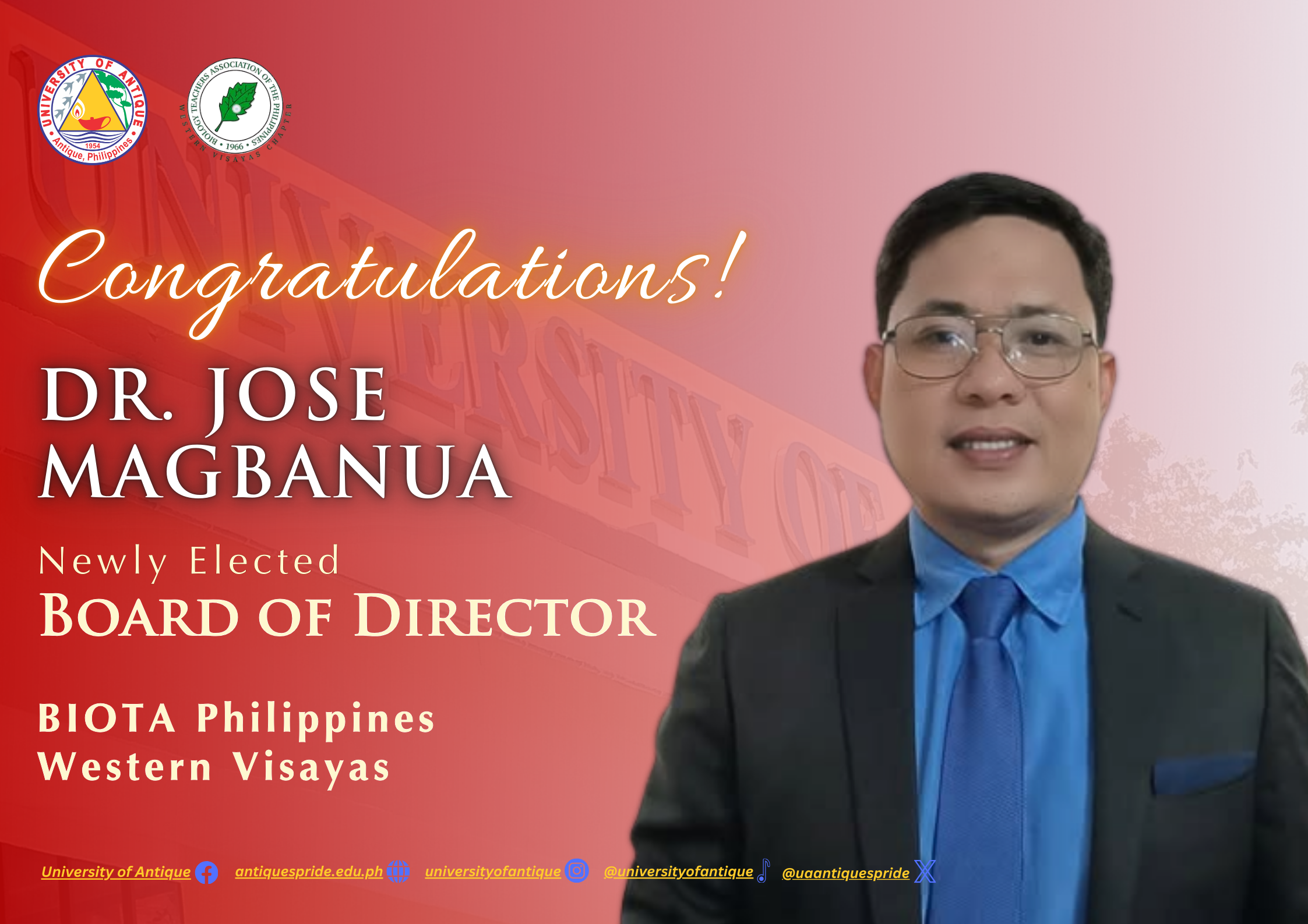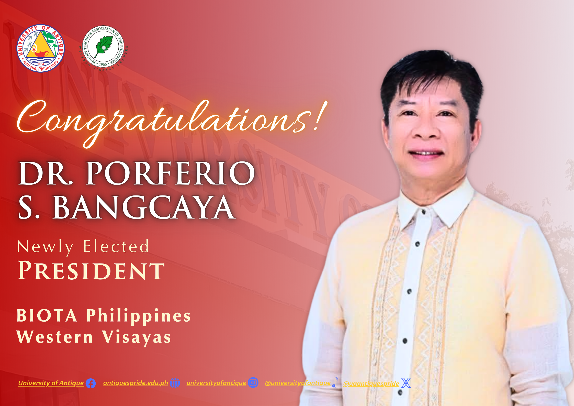 The UA community congratulates 𝐃𝐫. 𝐏𝐨𝐫𝐟𝐞𝐫𝐢𝐨 𝐁𝐚𝐧𝐠𝐜𝐚𝐲𝐚, our Campus Director for Tario Lim Memorial Campus and OIC-Campus Administrator for UA-Libertad Extension, on his appointment as President of the BIOTA Philippines – Western Visayas.
